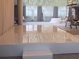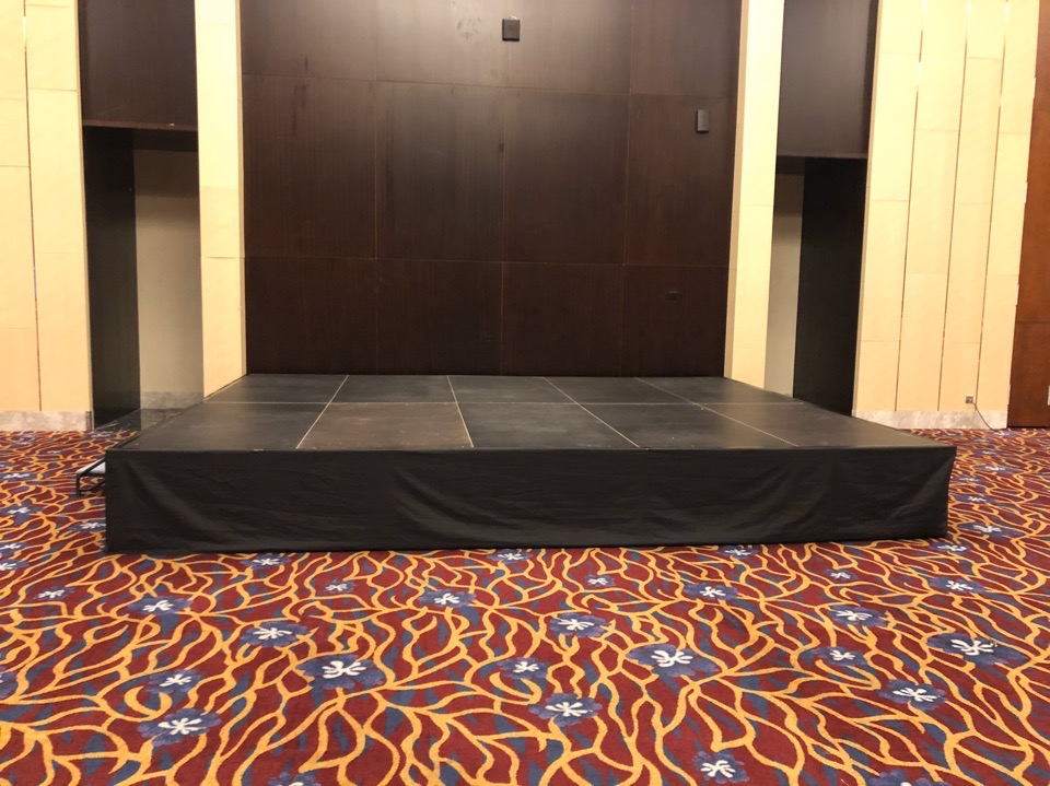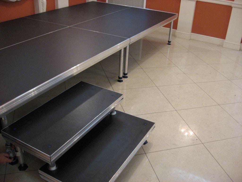 сделан из алюминиевого профиля и бакелитовой фанеры. Размер одного модуля 2 метра х 1 метр, высота может быть от 10 см., до 1м. Подиумы имеют возможность соединения между собой, что позволяет сделать поверхность любой площади. В основном такие подиумы используют, на небольших концертах или модельных показах.