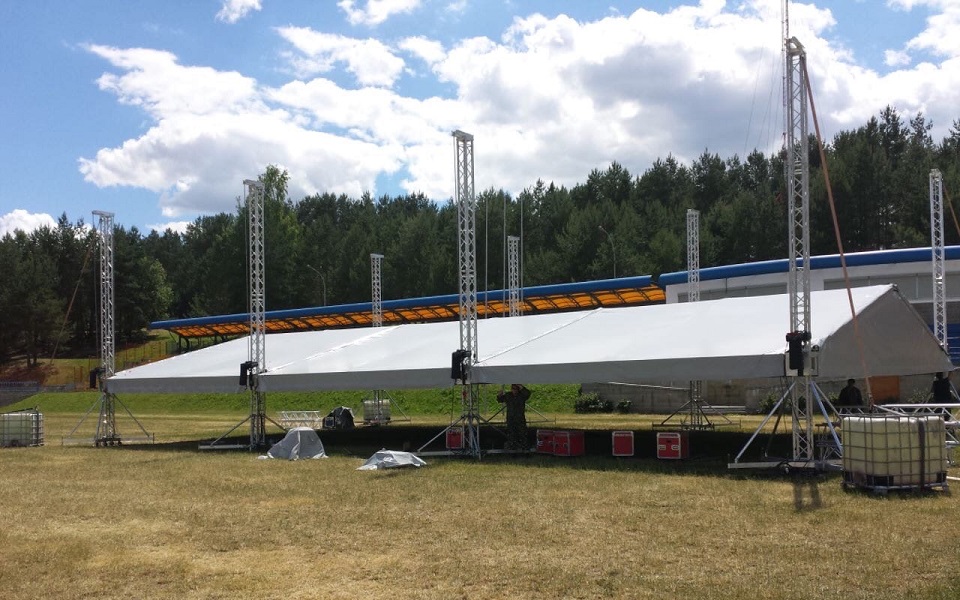 Сценические конструкции изготовлены из алюминиевой фермы, имеет двух скатную крышу, подъёмный механизм лебёдки. Подиум сценической конструкции изготовлен из оцинкованного метала и бакелитовой фанеры. Стоимость аренды включает в себя: алюминиевую ферму с крышей из ПВХ (серого цвета), задника и боковых стен изготовленного из специальной сетки (чёрног цвета) или ПВХ (серого цвета), сценического подиума с двумя лестницами. Эти сцены используются в основном для проведения больших концертов, масштабных мероприятиях и фестивалях.